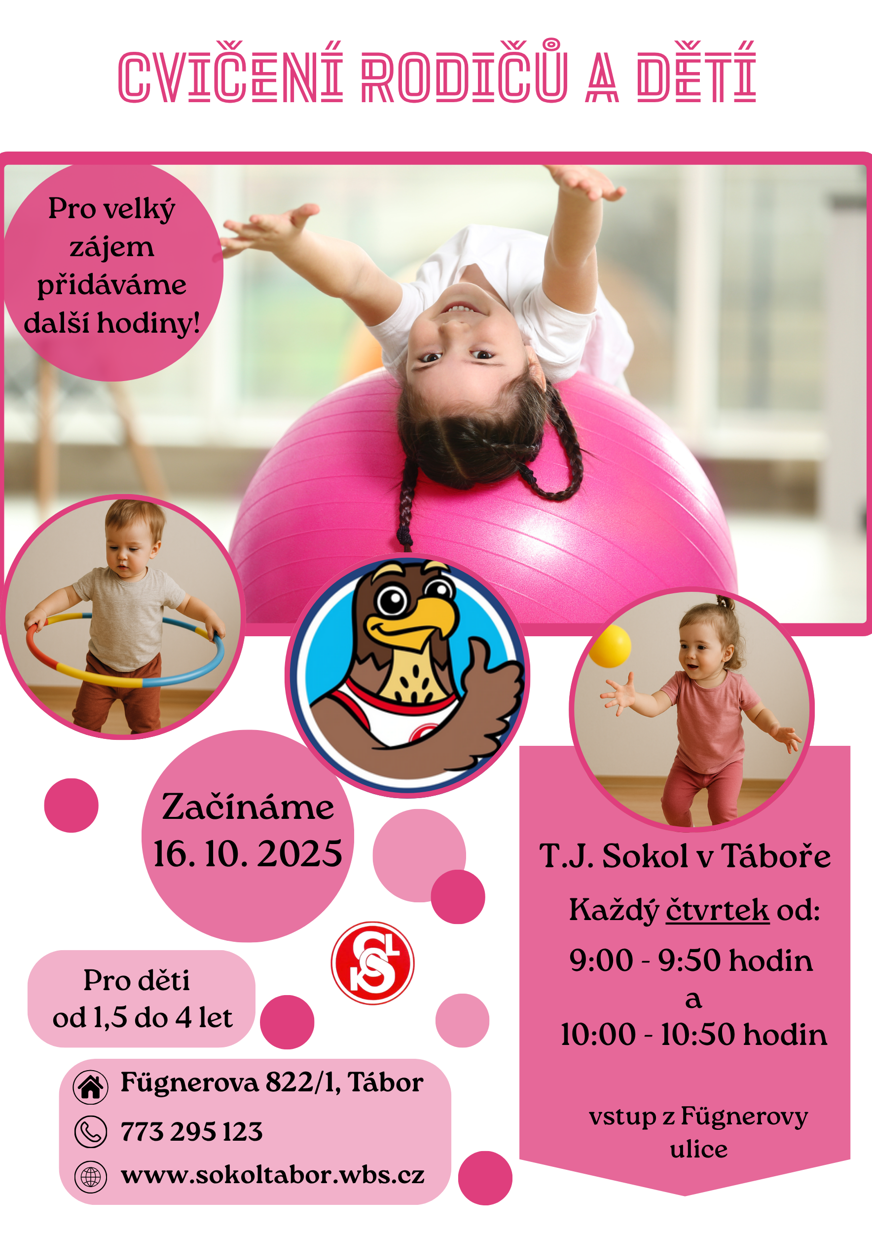 Pro velký zájem přidáváme další hodiny cvičení rodičů a dětí. Tentokrát ve čtvrtek dopoledne.